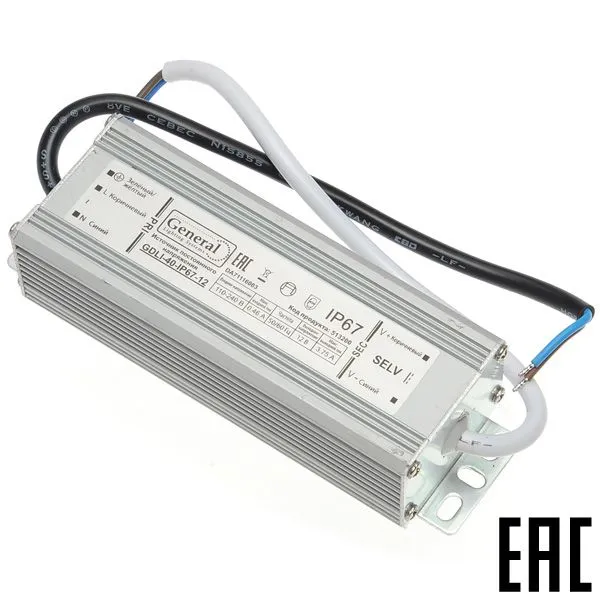 Драйвер светодиодный TM General со степенью защиты IP67 выполнен в компактном и герметичном металлическом корпусе, снабжен защитой от перегрузок и короткого замыкания, а также предназначен для работы в диапазоне от 110 до 240 Вольт.