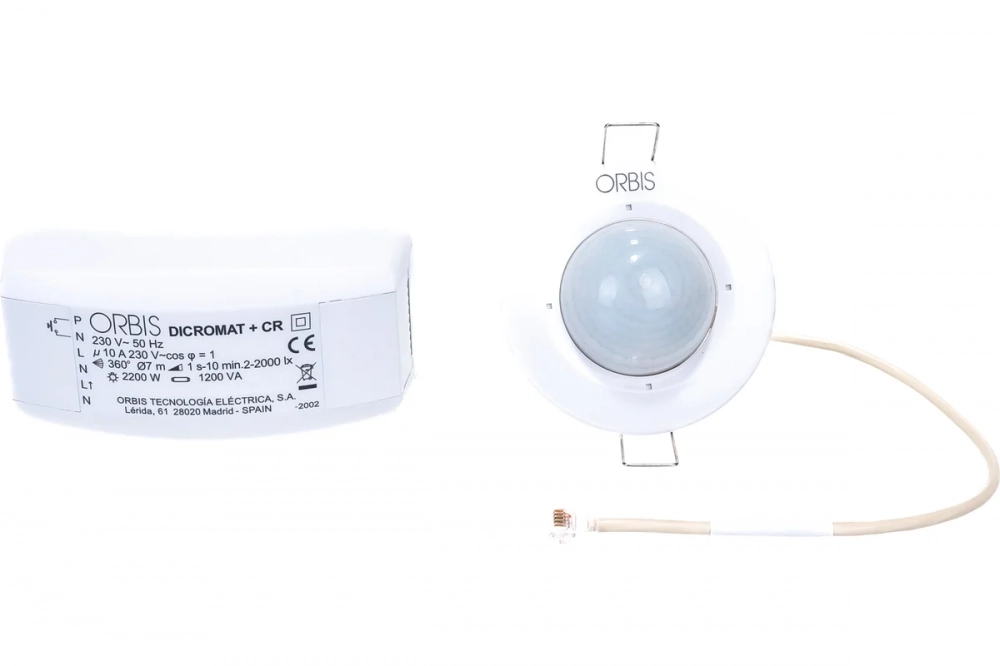 Датчик присутствия Orbis 360 градусов DICROMAT + CR удобен для управления, так как настройки можно выставлять при помощи пульта управления. Устройство состоит из датчика и блока питания. Наличие блока питания позволяет устанавливать несколько сенсоров. Датчик монтируется на потолок и срабатывает на расстоянии до 7 метров.