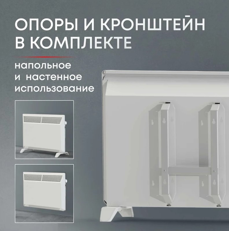 Конвектор представлен в стильном дизайне, что позволяет его легко вписать в любой интерьер. Комплектация включает опоры для напольной установки и кронштейны для настенного монтажа, что делает монтаж конвектора удобным и простым. Вы сможете выбрать оптимальный способ установки, соответствующий вашим потребностям и требованиям.