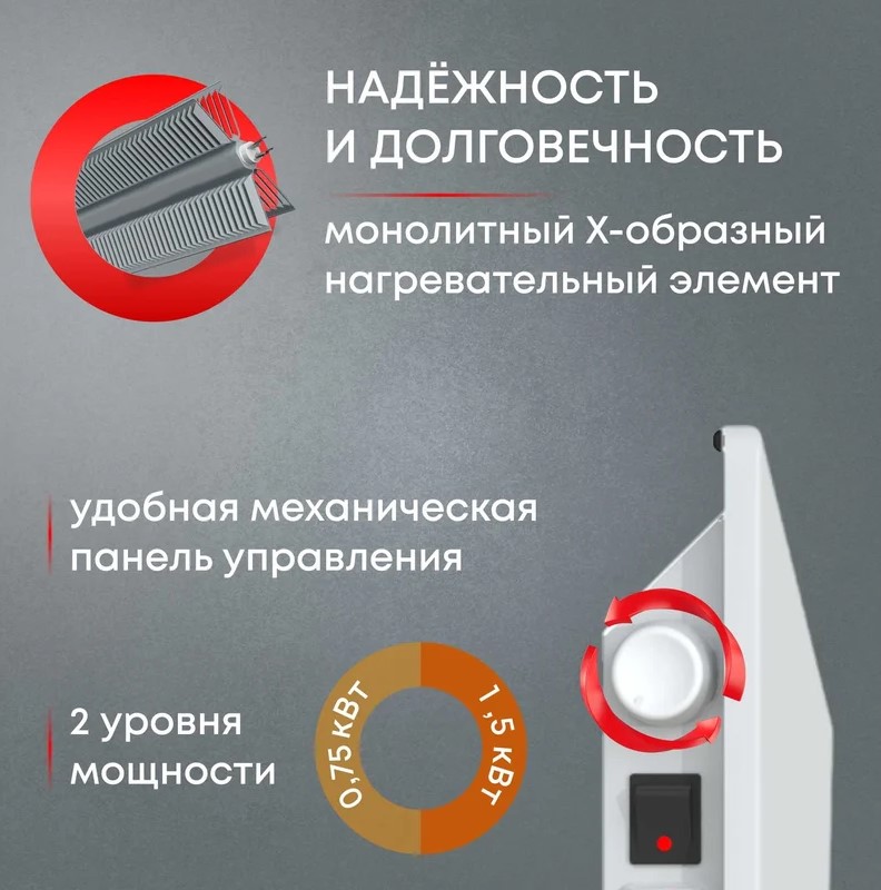 Конвектор работает от стандартной розетки с напряжением 220В, что делает его удобным и простым в использовании. Монолитный Х-образный нагревательный элемент обеспечивает надежность и долговечность обогревателя, что является экономичным решением.