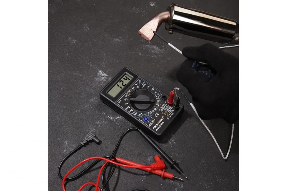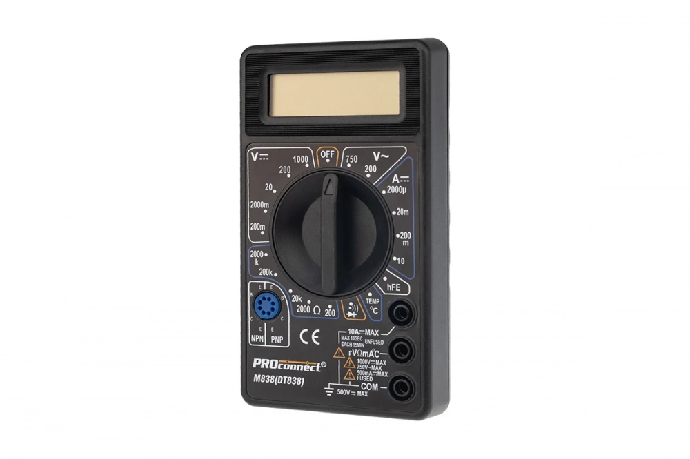 - Назначение инструмента:Измерение величин, Напряжение (В), Сопротивление (Ω), Температуры, Проверка транзисторов (hFE), Проверка диодов, Прозвонка