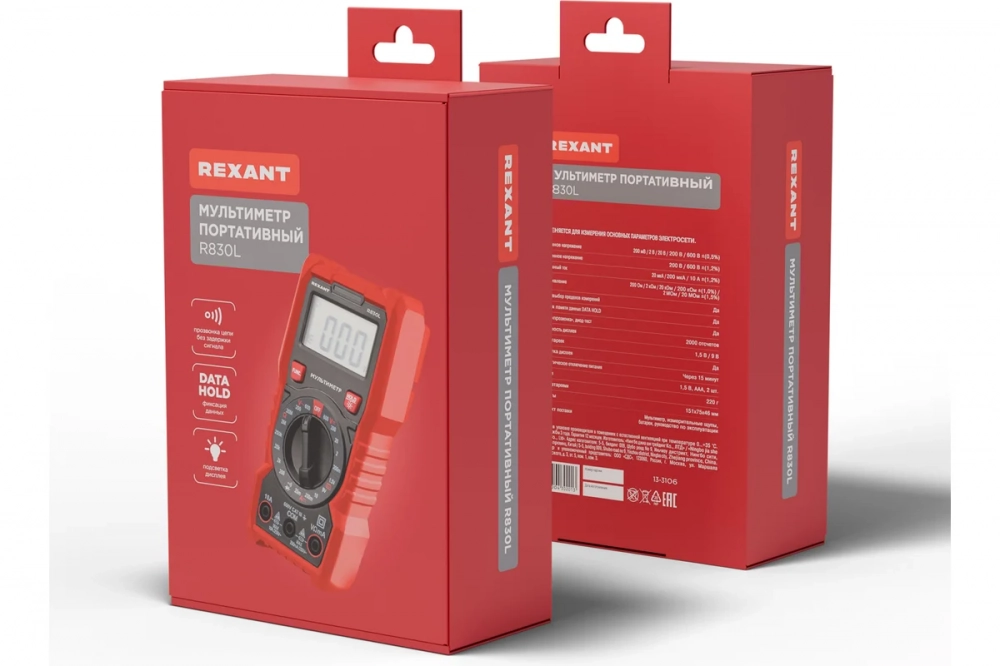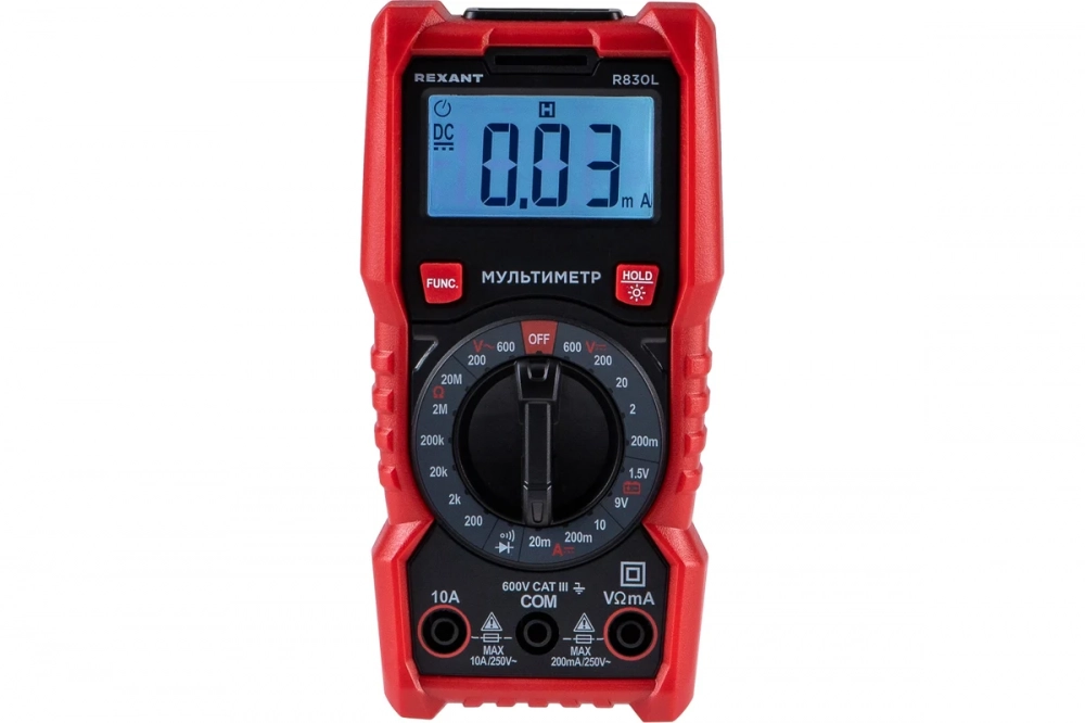 Портативный цифровой мультиметр R830L REXANT представляет собой современное устройство для точных измерений. Имеет ручной выбор диапазонов измерений. Предусмотрена функция удержания данных на дисплее DATA HOLD, которая позволяет запомнить данные, если измерение проводится в труднодоступном месте.
